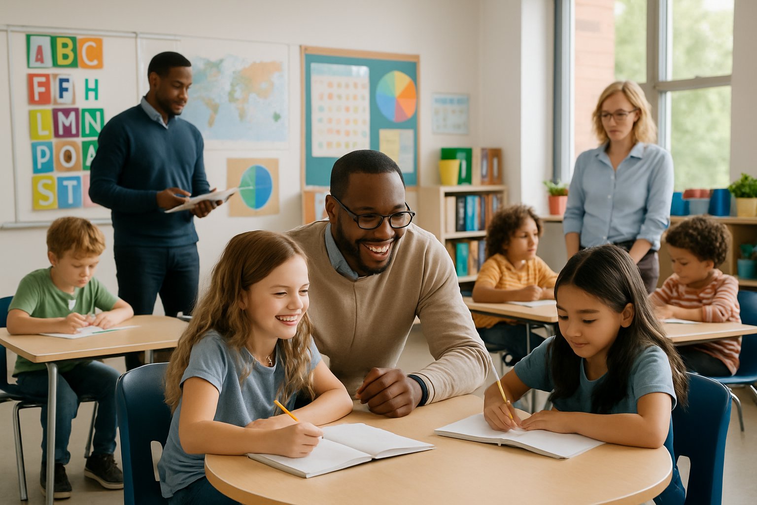 A teacher giving individual attention to a small group of students in a bright classroom while other students work independently.